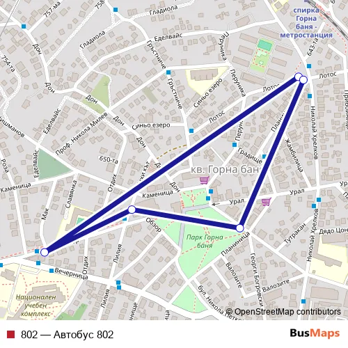 The first stop of the 802 bus route is Метростанция Горна Баня and the last stop is Метростанция Горна Баня. 802 (Автобус 802) is operational during on weekdays.