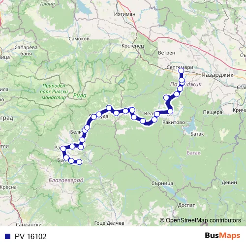 The first stop of the PV 16102 rail route is Добринище and the last stop is Септември. PV 16102 is operational during everyday.
