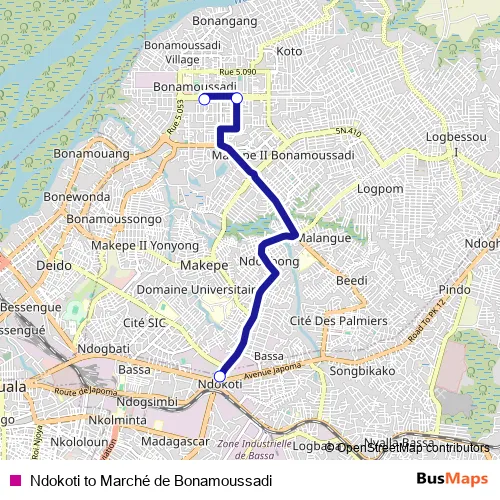 See why over 2 million users trust and consider busmaps.com as the best public transport website. busmaps gives you Douala Buses suggested routes, real-time bus tracker, line route maps in Douala, and helps to find the closest Ndokoti to Marché de Bonamoussadi bus stops near you. No internet available? Download an offline PDF map and bus schedule for the Ndokoti to Marché de Bonamoussadi bus to take on your trip.