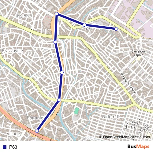See why over 2 million users trust and consider busmaps.com as the best public transport website. busmaps gives you Douala Buses suggested routes, real-time bus tracker, line route maps in Douala, and helps to find the closest P63 bus stops near you. No internet available? Download an offline PDF map and bus schedule for the P63 bus to take on your trip.
