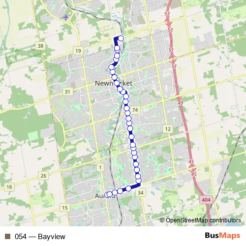 The first stop of the 054 bus route is Wellington ST E / Victoria St and the last stop is East Gwillimbury GO Station Platform 11. 054 (Bayview) is operational during everyday.