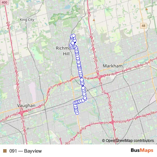 The first stop of the 091 bus route is Finch GO BUS Terminal Platform 3 and the last stop is Subrisco AV / Bayview Av. 091 (Bayview) is operational during everyday.
