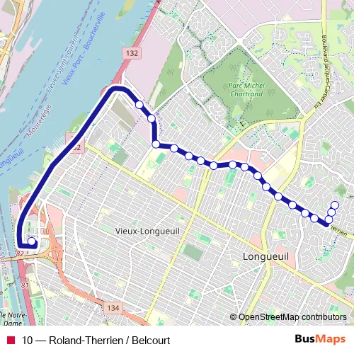 The first stop of the 10 bus route is Terminus Longueuil and the last stop is Boucher / Belcourt. 10 (Roland-Therrien / Belcourt) is operational during on weekends.