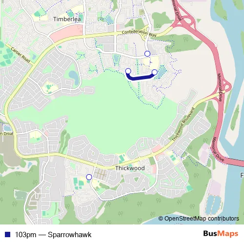The first stop of the 103pm bus route is Tundra Drive At Westwood Communi and the last stop is Sparrowhawk before Sparrowhawk b. 103pm (Sparrowhawk) is operational during everyday.