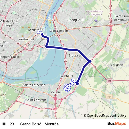 The first stop of the 123 bus route is Jacques-Martin / Benoît-Charlebois I and the last stop is Terminus Mansfield - Quai 1. 123 (Grand-Boisé - Montréal) is operational during on weekdays.