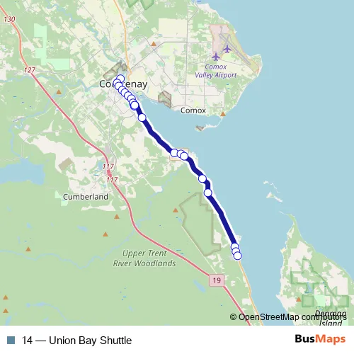 The first stop of the 14 bus route is Downtown Courtenay Bay A and the last stop is Hwy 19A at Mcleod Rd. 14 (Union Bay Shuttle) is operational during everyday.