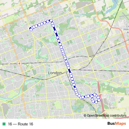 The first stop of the 16 bus route is Masonville Place Stop #6 - #1145 and the last stop is Commissioners west of Deveron 2 WB - #452. 16 (Route 16) is operational during everyday.