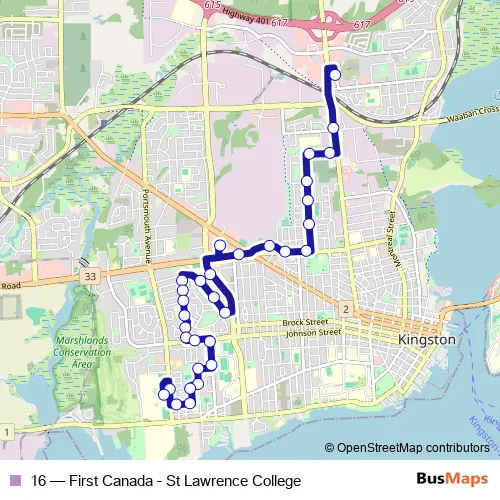 The first stop of the 16 bus route is First Canada / Weller and the last stop is St. Lawrence College. 16 (First Canada - St Lawrence College) is operational during everyday.