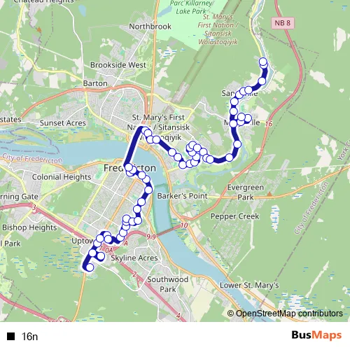 See why over 2 million users trust and consider busmaps.com as the best public transport website. busmaps gives you Fredericton Buses suggested routes, real-time bus tracker, line route maps in Fredericton, and helps to find the closest 16n bus stops near you. No internet available? Download an offline PDF map and bus schedule for the 16n bus to take on your trip.