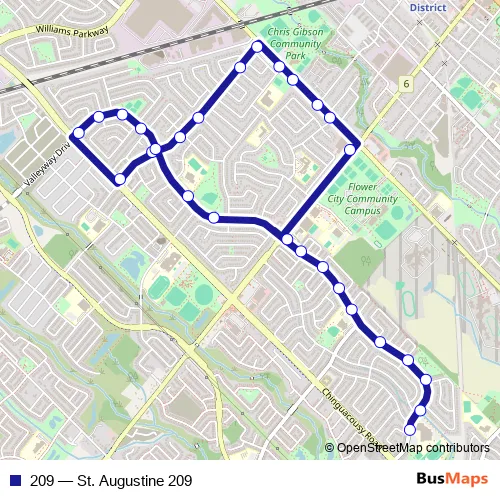 The first stop of the 209 bus route is Drinkwater Rd at St. Augustine S.S. and the last stop is Mclaughlin - Zum Queen West Station Stop Wb. 209 (St. Augustine 209) is operational during on weekdays.