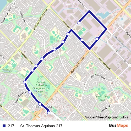 The first stop of the 217 bus route is Corporation Dr at Bramkay St and the last stop is Bramalea Terminal Route 12 / 205 / 217. 217 (St. Thomas Aquinas 217) is operational during on weekdays.
