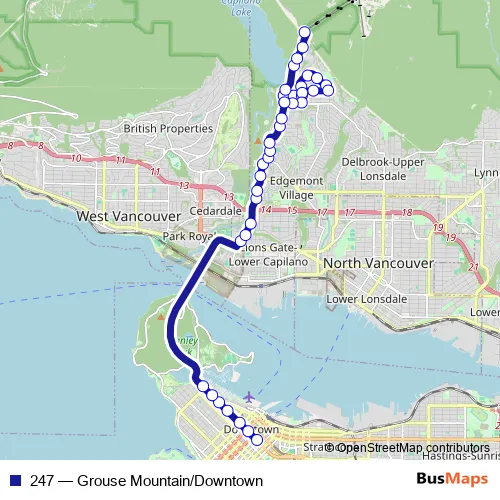 The first stop of the 247 bus route is Westbound W Georgia St @ Homer St and the last stop is Grouse Mountain @ Skyride. 247 (Grouse Mountain/Downtown) is operational during on weekdays.
