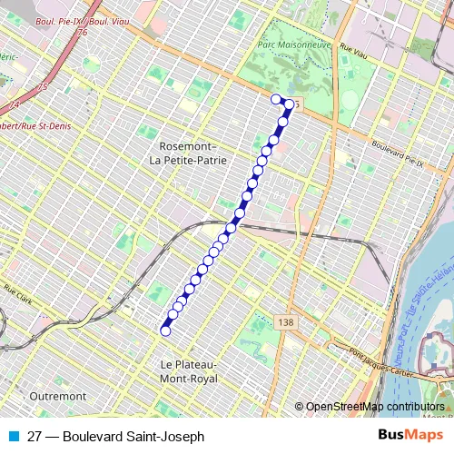 The first stop of the 27 bus route is Laurier / Pie-Ix and the last stop is Station Laurier (Berri / Saint-Joseph). 27 (Boulevard Saint-Joseph) is operational during everyday.