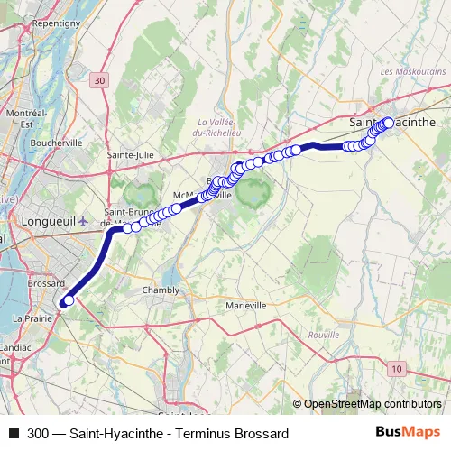 The first stop of the 300 bus route is Terminus Brossard - Quai 4 and the last stop is Terminus Saint-Hyacinthe. 300 (Saint-Hyacinthe - Terminus Brossard) is operational during on weekdays.