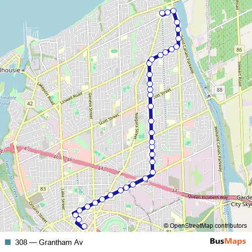 The first stop of the 308 bus route is ST. Catharines BUS Terminal and the last stop is Niagara ST + Grantham Lions Park. 308 (Grantham Av) is operational during on weekdays.