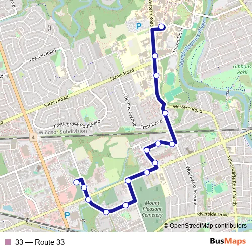 The first stop of the 33 bus route is Farrah at Proudfoot EB - #717 and the last stop is Alumni Hall WB - #142. 33 (Route 33) is operational during on weekdays.