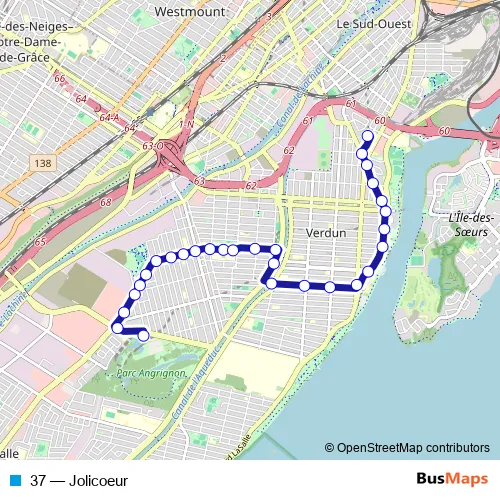 The first stop of the 37 bus route is Station Angrignon and the last stop is Station Lasalle (Caisse / de Rushbrooke). 37 (Jolicoeur) is operational during everyday.