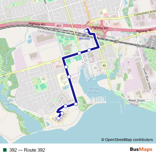 The first stop of the 392 bus route is Ontario Shores (West Entrance) and the last stop is Whitby Station. 392 (Route 392) is operational during on weekdays.