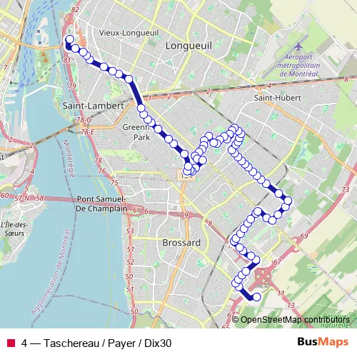 See why over 2 million users trust and consider busmaps.com as the best public transport website. busmaps gives you Longueuil Buses suggested routes, real-time bus tracker, line route maps in Longueuil, and helps to find the closest 4 bus stops near you. No internet available? Download an offline PDF map and bus schedule for the 4 bus to take on your trip.