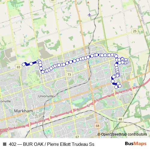 The first stop of the 402 bus route is Angus Glen C.C. Stop # 1340 and the last stop is Kenilworth Gate / THE Barley LEA St. 402 (BUR OAK / Pierre Elliott Trudeau Ss) is operational during on weekdays.