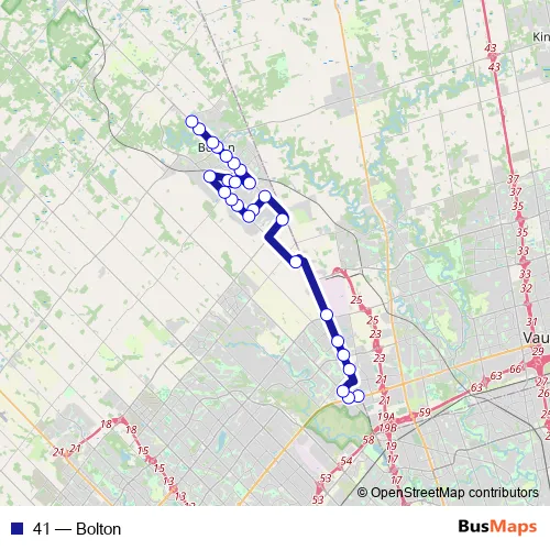 The first stop of the 41 bus route is Highway 50 - Zum Queen Station Stop Wb and the last stop is Highway 50 at Caledon Recreation Centre. 41 (Bolton) is operational during on weekdays.