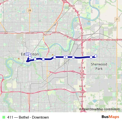 The first stop of the 411 bus route is 105 Street & 104 Avenue and the last stop is Bethel Transit Terminal. 411 (Bethel - Downtown) is operational during everyday.