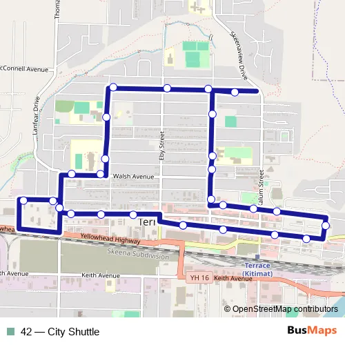 The first stop of the 42 bus route is Lakelse at Skeena Mall and the last stop is Lakelse at Skeena Mall. 42 (City Shuttle) is operational during everyday.