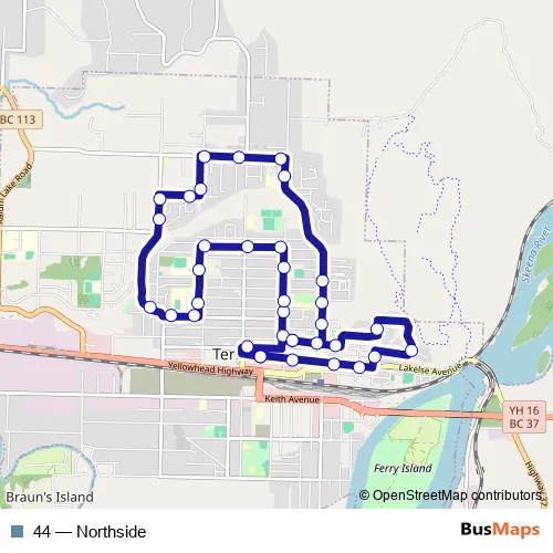 The first stop of the 44 bus route is Lakelse at Skeena Mall and the last stop is Lakelse at Skeena Mall. 44 (Northside) is operational during on weekdays.