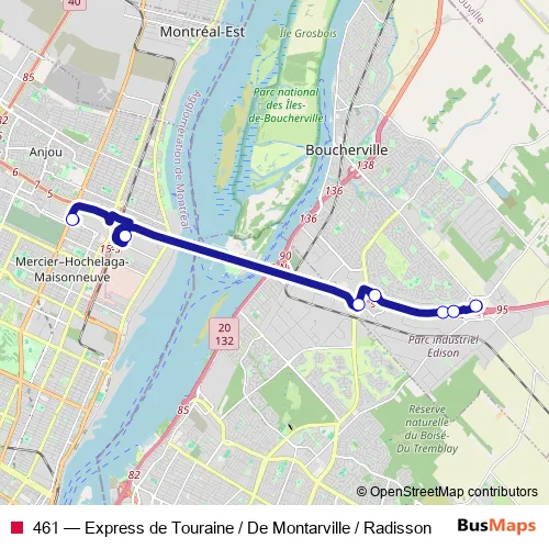 The first stop of the 461 bus route is Terminus Radisson and the last stop is Stationnement de Touraine. 461 (Express de Touraine / De Montarville / Radisson) is operational during everyday.