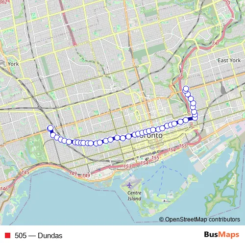 See why over 2 million users trust and consider busmaps.com as the best public transport website. busmaps gives you Toronto Trams suggested routes, real-time bus tracker, line route maps in Toronto, and helps to find the closest 505 tram stops near you. No internet available? Download an offline PDF map and bus schedule for the 505 tram to take on your trip.