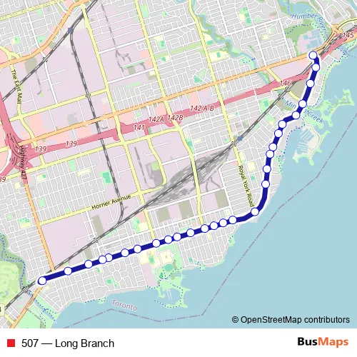 The first stop of the 507 tram route is Humber Loop at The Queensway and the last stop is Long Branch Loop - Long Branch GO Station. 507 (Long Branch) is operational during everyday.
