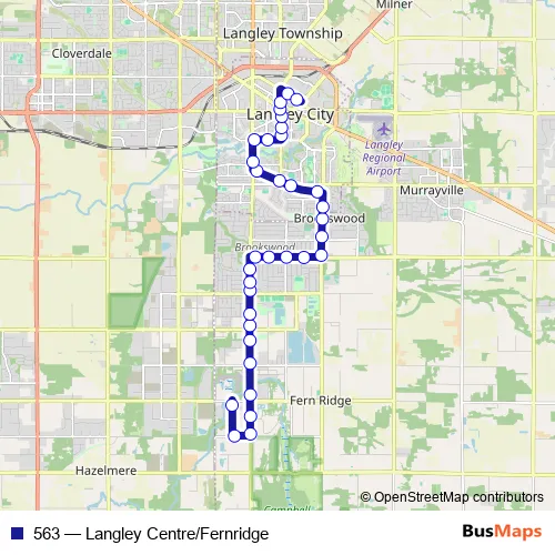 The first stop of the 563 bus route is Southbound 198 St @ 24 Ave and the last stop is Langley Centre @ Bay 6. 563 (Langley Centre/Fernridge) is operational during everyday.