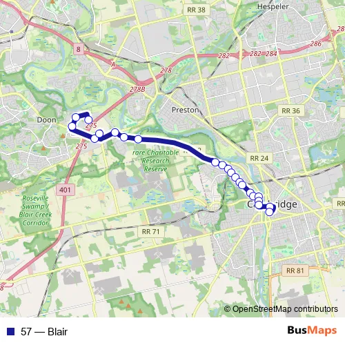 The first stop of the 57 bus route is Conestoga College Doon Campus - Door 3 and the last stop is Ainslie Terminal. 57 (Blair) is operational during everyday.