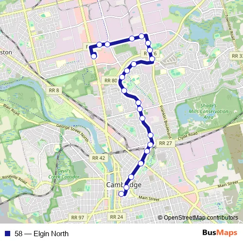 The first stop of the 58 bus route is Ainslie Terminal and the last stop is Cambridge Centre Station. 58 (Elgin North) is operational during everyday.