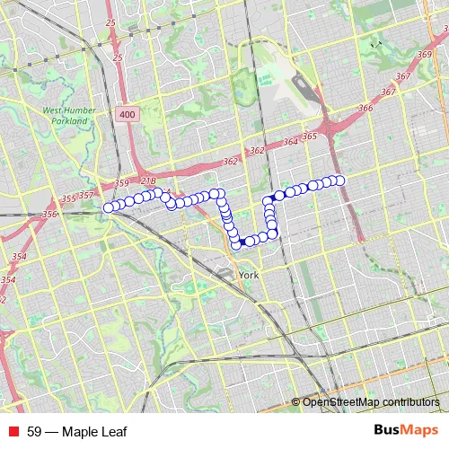 The first stop of the 59 bus route is Lawrence West Station and the last stop is Oak St at Weston Rd. 59 (Maple Leaf) is operational during everyday.