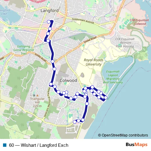The first stop of the 60 bus route is Royal Bay Exch Bay A and the last stop is Langford Exch Bay B. 60 (Wishart / Langford Exch) is operational during everyday.