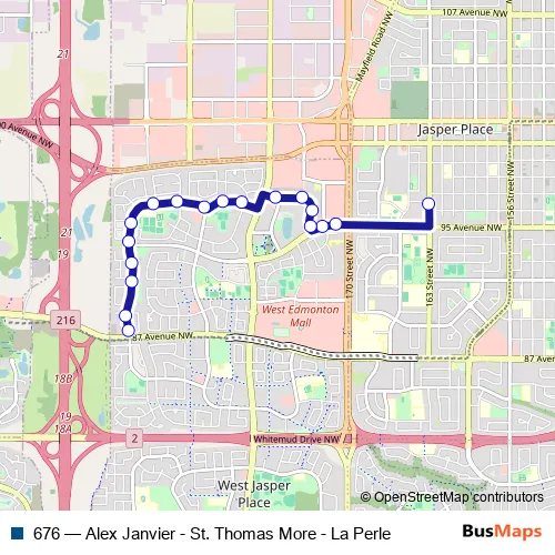 The first stop of the 676 bus route is 165 Street & 95 Avenue and the last stop is 189 Street & 87A Avenue. 676 (Alex Janvier - St. Thomas More - La Perle) is operational during on weekdays.