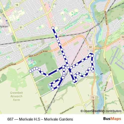 The first stop of the 687 bus route is Vaan / Woodroffe and the last stop is Merivale / Viewmount. 687 (Merivale H.S – Merivale Gardens) is operational during on weekdays.