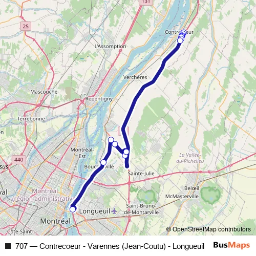 The first stop of the 707 bus route is Terminus Contrecoeur - Quai 1 and the last stop is Terminus Longueuil Porte G4. 707 (Contrecoeur - Varennes (Jean-Coutu) - Longueuil) is operational during on weekdays.