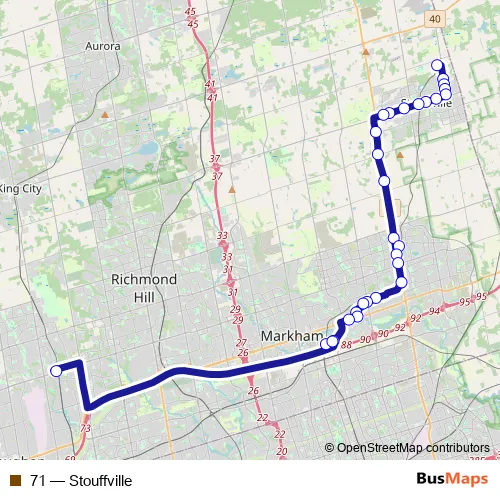 See why over 2 million users trust and consider busmaps.com as the best public transport website. busmaps gives you Stouffville Buses suggested routes, real-time bus tracker, line route maps in Stouffville, and helps to find the closest 71 bus stops near you. No internet available? Download an offline PDF map and bus schedule for the 71 bus to take on your trip.