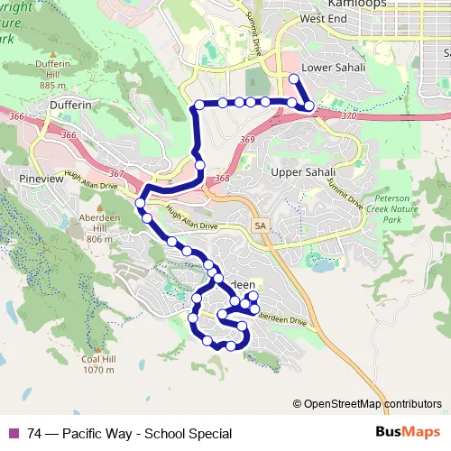 The first stop of the 74 bus route is Summit Dr at Arrowstone Dr and the last stop is Pacific Way at Greystone Cres. 74 (Pacific Way - School Special) is operational during on weekdays.