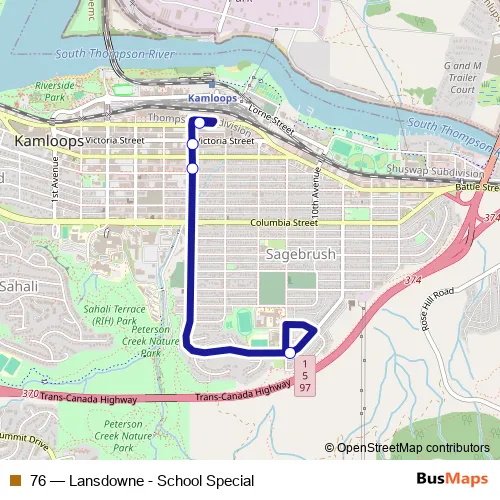 See why over 2 million users trust and consider busmaps.com as the best public transport website. busmaps gives you Kamloops Buses suggested routes, real-time bus tracker, line route maps in Kamloops, and helps to find the closest 76 bus stops near you. No internet available? Download an offline PDF map and bus schedule for the 76 bus to take on your trip.