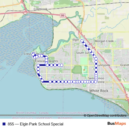 The first stop of the 855 bus route is Southbound King George Blvd @ Crescent Rd and the last stop is Eastbound 24 Ave @ 136 St. 855 (Elgin Park School Special) is operational during on weekdays.