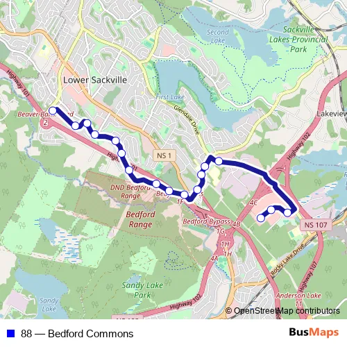 The first stop of the 88 bus route is Damascus Rd At Turning Loop (8505) and the last stop is Sackville Terminal Bay 1 (8958). 88 (Bedford Commons) is operational during everyday.