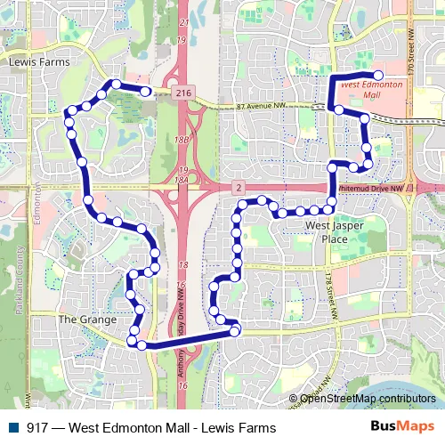 The first stop of the 917 bus route is West Edmonton Mall Transit Centre and the last stop is Lewis Farms Transit Centre. 917 (West Edmonton Mall - Lewis Farms) is operational during everyday.