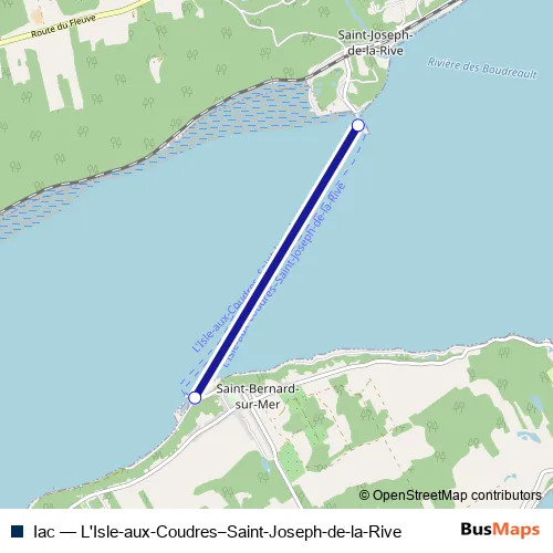 The first stop of the Iac ferry route is L'Isle-aux-Coudres and the last stop is St-Joseph-de-la-Rive. Iac (L'Isle-aux-Coudres–Saint-Joseph-de-la-Rive) is operational during everyday.
