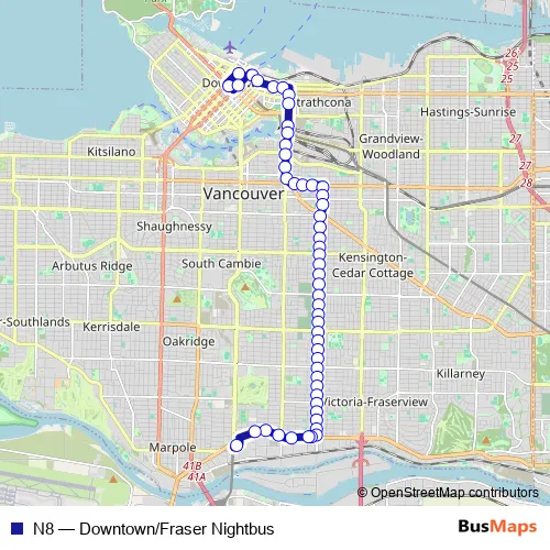 The first stop of the N8 bus route is Westbound W Pender St @ Howe St and the last stop is Marine Drive Station @ Bay 2. N8 (Downtown/Fraser Nightbus) is operational during everyday.