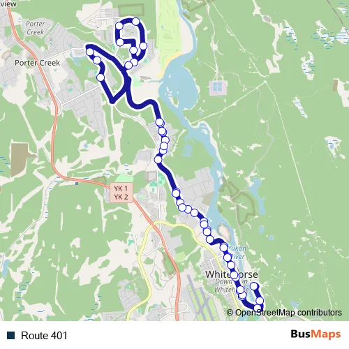 The first stop of the Route 401 bus route is 2nd Avenue & Steele Street and the last stop is Yukon Visitor Information Centre. Route 401 is operational during everyday.