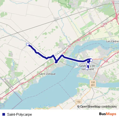 The first stop of the Saint-Polycarpe bus route is 1263 chem. Élie-Auclair (Hôtel de Ville) and the last stop is Collège de Valleyfield, Entrée Principale (169 rue Champlain). Saint-Polycarpe (Saint-Polycarpe) is operational during everyday.