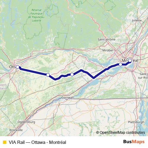 The first stop of the VIA Rail rail route is Montréal and the last stop is Ottawa. VIA Rail (Ottawa - Montréal) is operational during everyday.